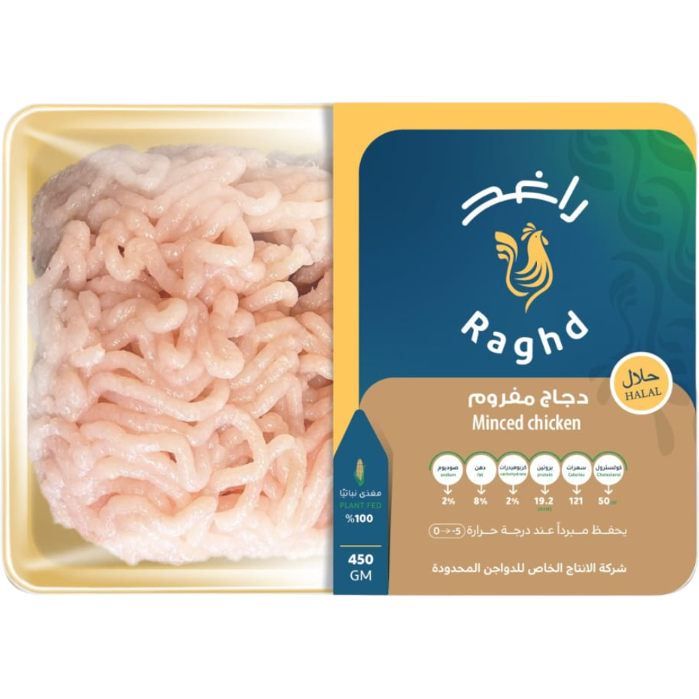 دجاج مفروم طازج من راغد، خالي من الإضافات والمواد الحافظة، مناسب لتحضير البرجر، الكفتة، والمعجنات، بجودة عالية ونكهة لذيذة.